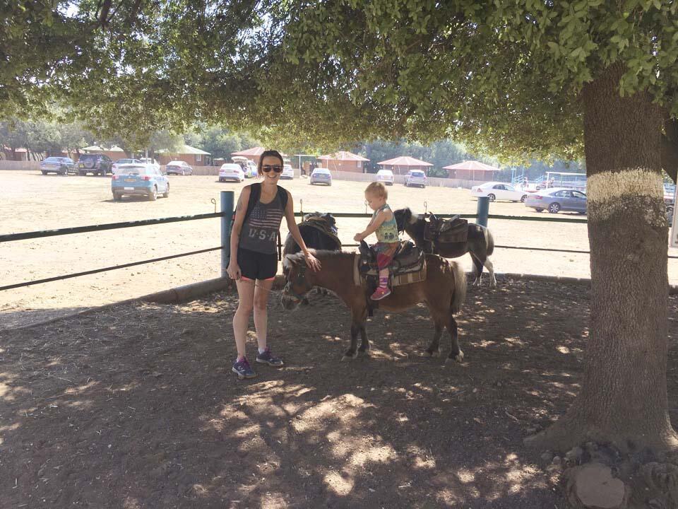 Мы были в загоне, где можно потрогать кроликов, морских свинок, уточек и цыплят. Для детей это восторг. Леина подруга чуть постарше, ей два года и два месяца. Девочку зовут Амалия, и она бесстрашно гладила всех животных, каталась на пони и веселилась при виде оленят.