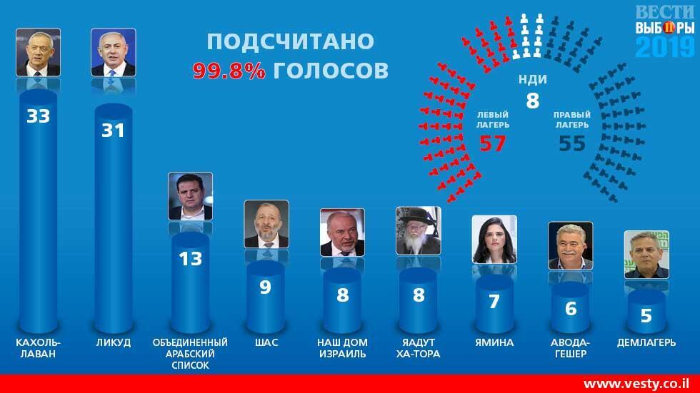 Подсчитаны 99,8% голосов. У Кахоль-Лаван по-прежнему 33 мандата, у Ликуда 31, у НДИ 8. Объединенный арабский список получил 13 мест в кнессете XXII созыва