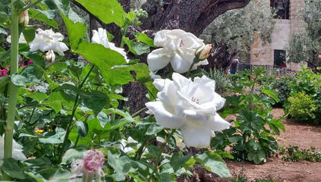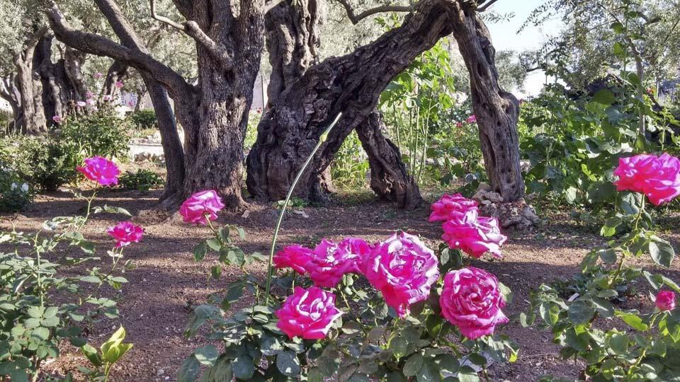 В наше время это небольшой, но очень красивый сад. В нем растут уже упомянутые восемь масличных деревьев. А сейчас, в мае, распустились розы. Их цветение на фоне морщинистых олив символизирует и всепобеждающую красоту жизни, и связь времен, и - если у вас достаточно фантазии - капли алой крови, проливаемой с начала времен за Иерусалим.