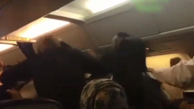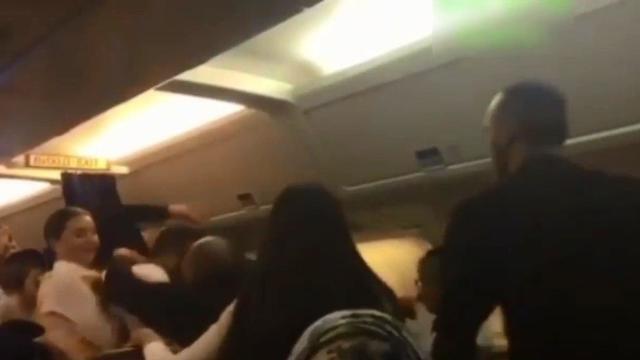 Инцидент, снятый на видео одним из очевидцев, произошел 19 марта, но попал в социальные сети лишь спустя несколько недель. На записи видно, как двое мужчин набросились друг на друга с кулаками, а двое других пытаются их разнять. Досталось и стюардессе, которая пыталась вмешаться и прекратить драку, - ей пришлось отступить и дождаться, пока страсти немного утихнут.