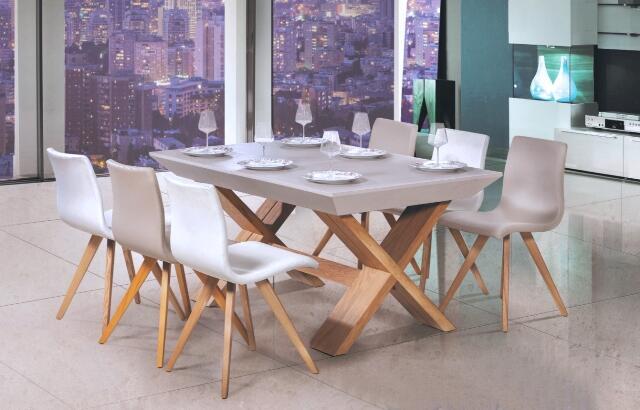 В пример приведем обеденный гарнитур Madrid с 6 стульями. У стола бетонная столешница, он раскладывается до 360 см. В сложенном виде его размеры вполне удобны для обычной жизни семьи: 160х100 см. Сейчас этот столовый гарнитур можно приобрести за 8900 шекелей (вместо 10.900 шекелей).