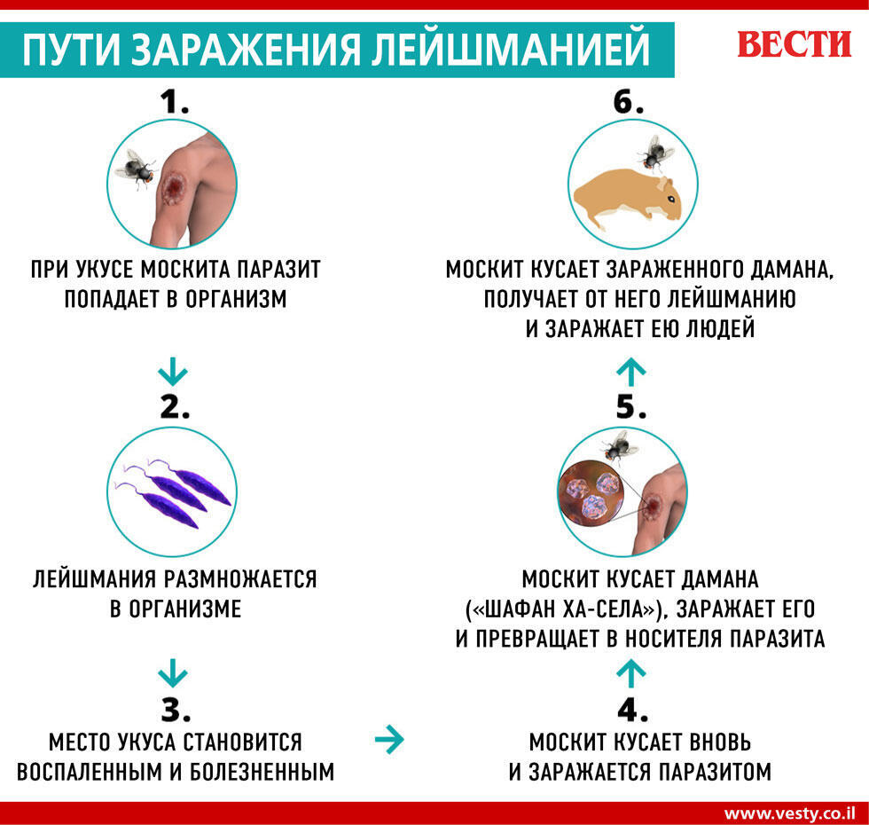 Болезнь передается при укусе москита Phlebotomus ("звув ха-холь"), главным образом в вечерние часы. Место укуса превращается со временем в незаживающую язву.