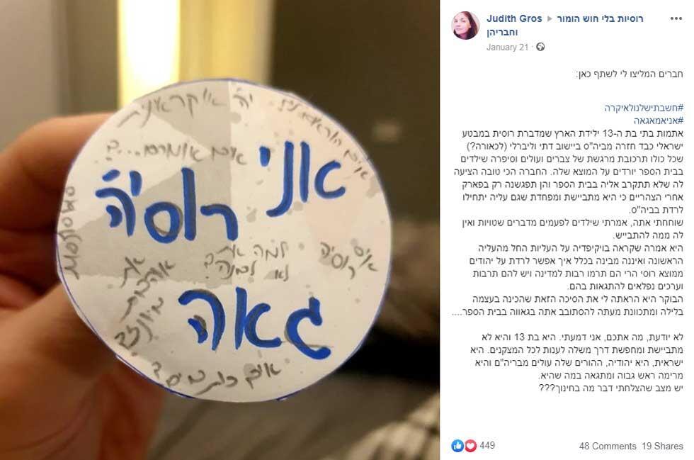 Автор поста - Йудит Вайнштейн-Грос. Она написала на иврите: "Моя 13-летняя дочь, родившаяся в Израиле и говорящая по-русски с сильным израильским акцентом, вернулась из школы расстроенная. Дочь сказала, что над "русскими" детьми насмехаются и отпускают в их адрес обидные шутки. Дошло до того, что ее подружка решила встречаться с ней только после школы - в парке, чтобы тоже не стать объектом насмешек.