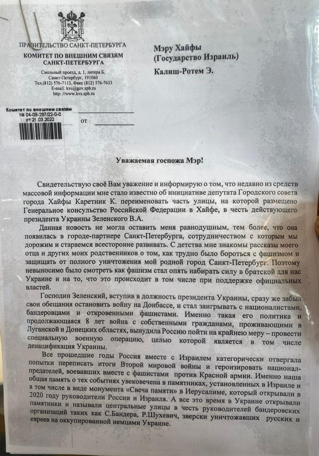 Ее организатор, депутат горсовета Хайфы Кирилл Каретник не так давно обратился к мэру Хайфы с инициативой переименовать часть улицы возле российского консульства в улицу Владимира Зеленского. Гражданин страны, избранный представитель законодательной ветви власти обращается к мэру своего города с неким начинанием. Почему-то информация немедленно оказывается в доступе у представителей иностранного государства. И оно разнообразно дает ответ, который назвать симметричным можно с большой натяжкой. Кирилл Каретник любезно переслал мне попавшее к нему письмо мэру Хайфы от комитета по внешним связям Санкт-Петербурга, побратима Хайфы.
